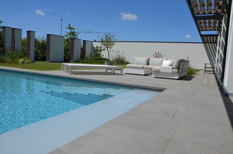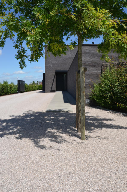Bij deze moderne woning met strakke architectuur brengt de tuin de nodige rust en balans . De beplanting werd uitgekozen voor een subtiele samenhang van bloei, blad- en groencontrasten .