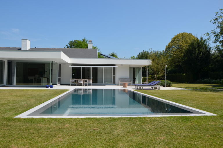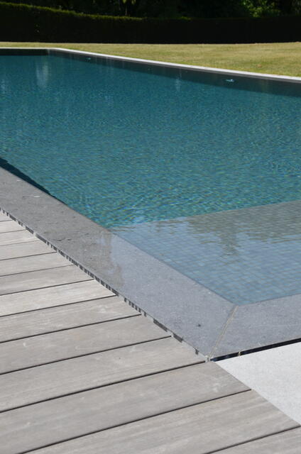 Het overloopzwembad in donker mozaïek afwerking integreert perfect in groene decor.