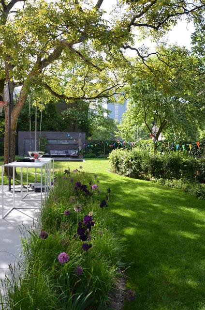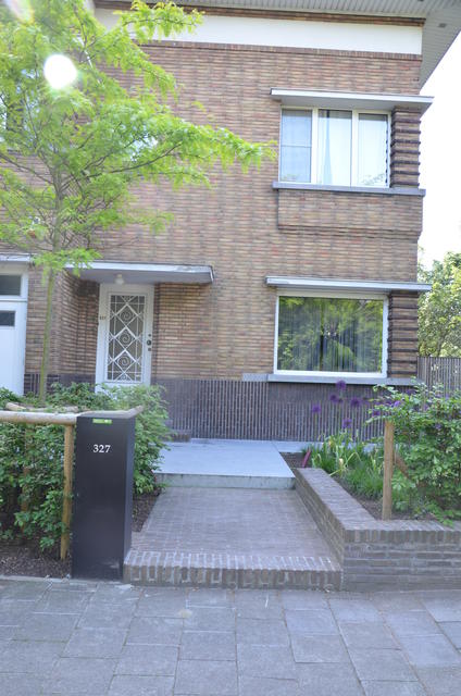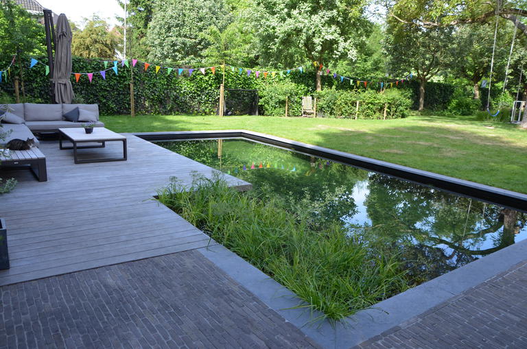 Totaalrenovatie van stadstuin bij interbellum woning te Gent . Passend bij de woning werd gekozen voor gepolierde beton afgewisseld met gebakken kleiklinkers. De zwemvijver op einde van de tuin is omgeven door een groot zonneterras . Tuin werd kindvriendelijke ingericht met behoud van de meeste waardevolle (klim)bomen . Sfeervolle beplanting is er voor elk seizoen.