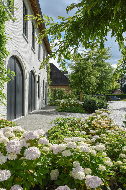 Bij de plantenkeuze werden planten gekozen met mooie bladcontrasten, bloei en verschillende groentinten in de schaduwzones. Rond het overdekt terras werden keukenkruiden en bloeiende beplantingen voorzien.