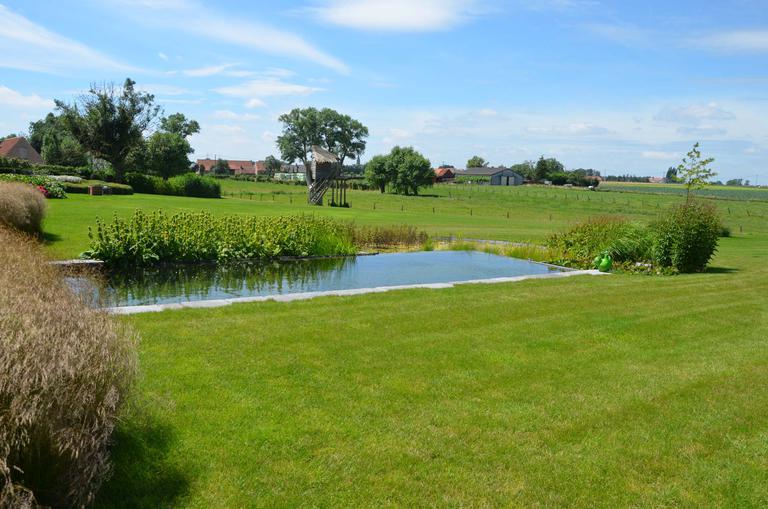 In deze tuin is de zwemvijver voorzien in het verlengde van het bijgebouw . Door de vijver al een stuk lager aan te leggen op het hellende terrein en te omgeven door een natuurlijke moeraszone en planten border bekomen we een mooie integratie van het geheel in het open landschap.